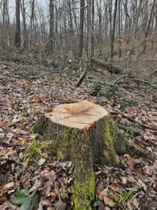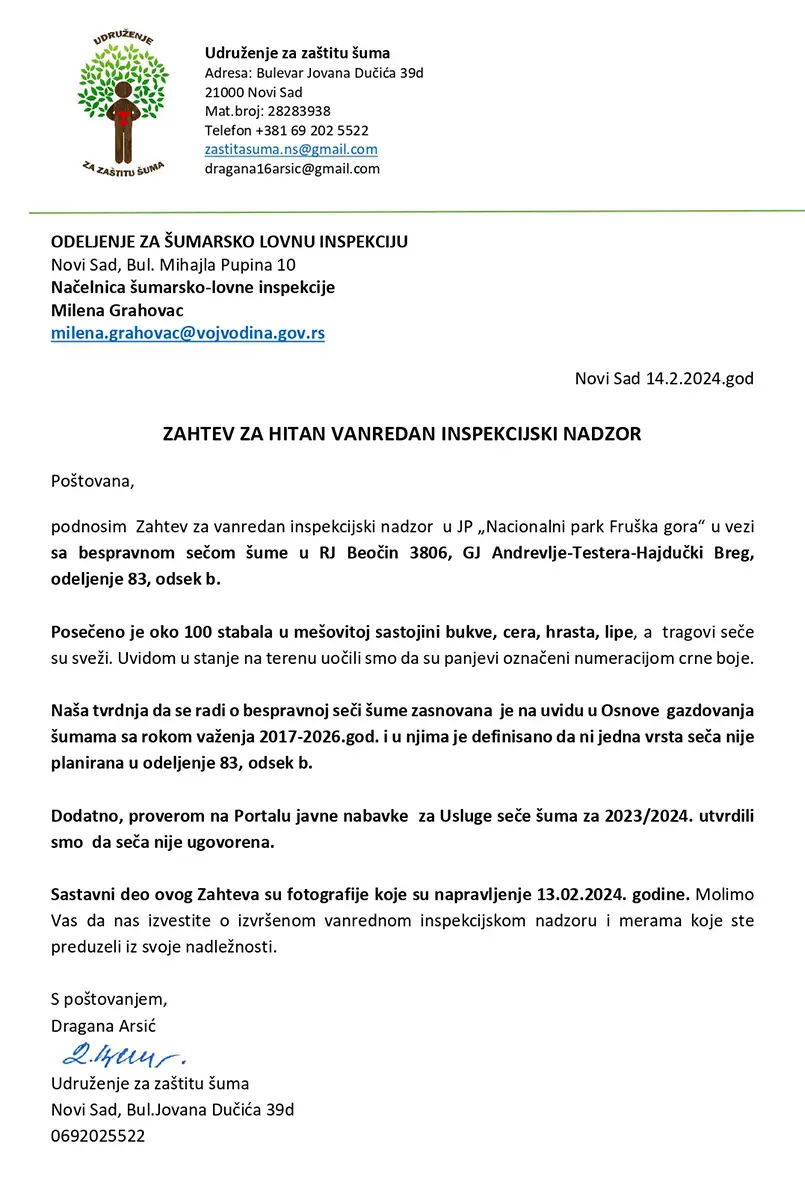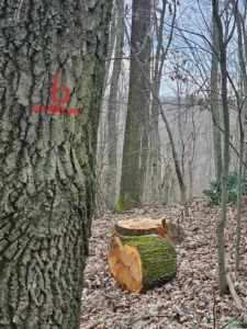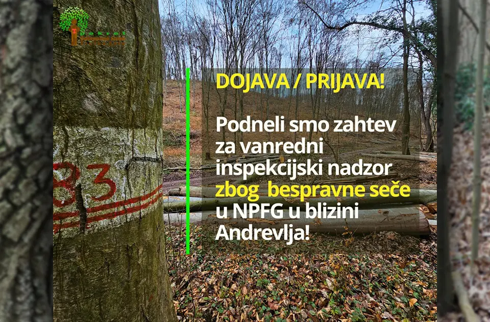 Nakon saznanja da je izvršena bespravna seča oko 100 stabala u RJ Beočin, Gazdinska jedinica Andrevlje-Testera-Hajdučki breg, naša terenska ekipa je obišla lokaciju, fotografisala i snimila tragove skorašnje seče u Odeljenju 83, odsek b. Dakle dokaze imamo! U pitanju je mešovita šumska sastojina cera, bukve, hrasta, lipe.