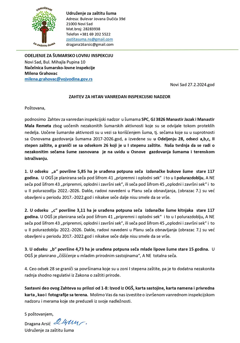 Podneli smo Zahtev za vanredni inspekcijski nadzor šumarskoj inspekciji.