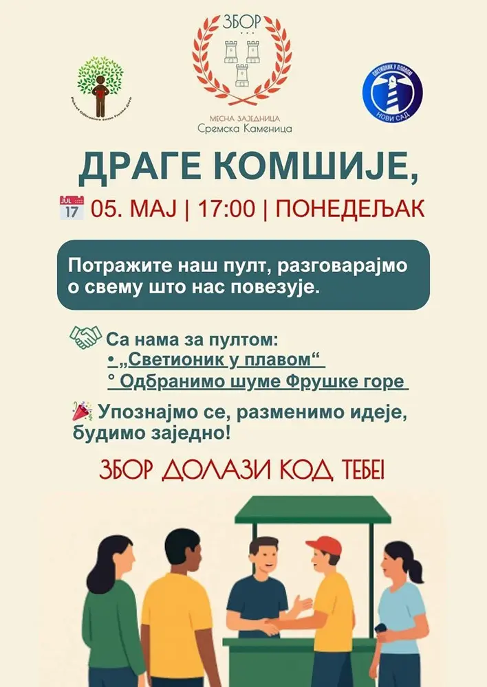 U kontekstu aktuelnih društvenih događanja, buđenja i mobilisanja građana u lokalnim zajednicama da se uključe u razne građanske aktivnosti koje mogu doprineti pozitivnim društvenim promenama, prihvatili smo poziv Mesne zajednice Sremska Kamenica da se uključimo u zborske aktivnosti. Održana su 2 zbora sa našim aktivnim učešćem kao saradničke ekološke organizacije.