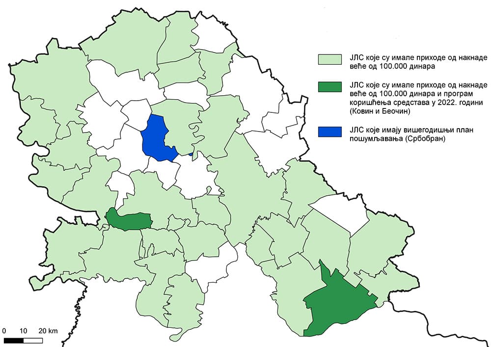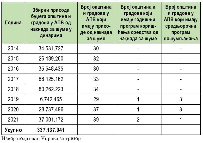 Samo dve vojvođanske opštine imale su u 2022. godini program korišćenja novca od naknada za seču šume. Samo jedna ima višegodišnji plan pošumljavanja, dok 25 njih nije planiralo da poveća površine pod šumom. Samo 8 njih je u 2021. godini sadilo poljozaštitne pojaseve sa malim iznosima novca.