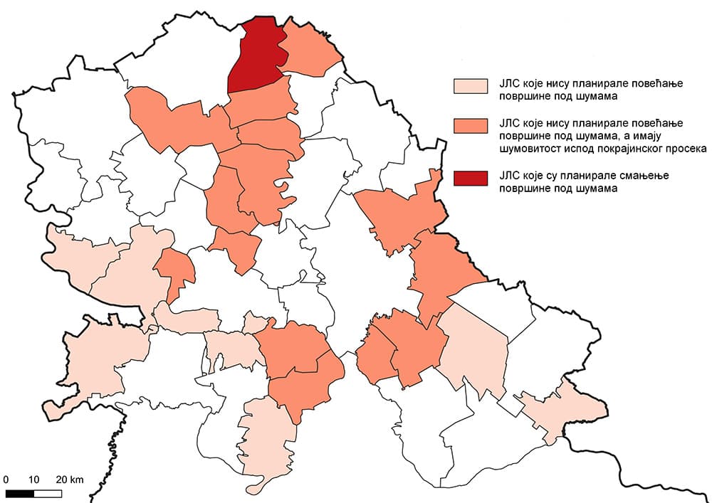 Lokalne samouprave koje su u prostornim planovima planirale povećanje površine pod šumama, činile su to na račun smanjenja površine državnog poljoprivrednog zemljišta. Ali se planirano u praksi ne sprovodi. Iako je ovo zemljište gotovo jedina površina na raspolaganju, ne postoji volja da se ono i izdvoji za pošumljavanje, jer se tako gube prihodi od zakupa. Zabeleženo je više slučajeva da opština odredi neku parcelu za pošumljavanje, a onda posle nekoliko godina istu površinu izda u zakup, pa zakupac sadnice preore ili uništi.