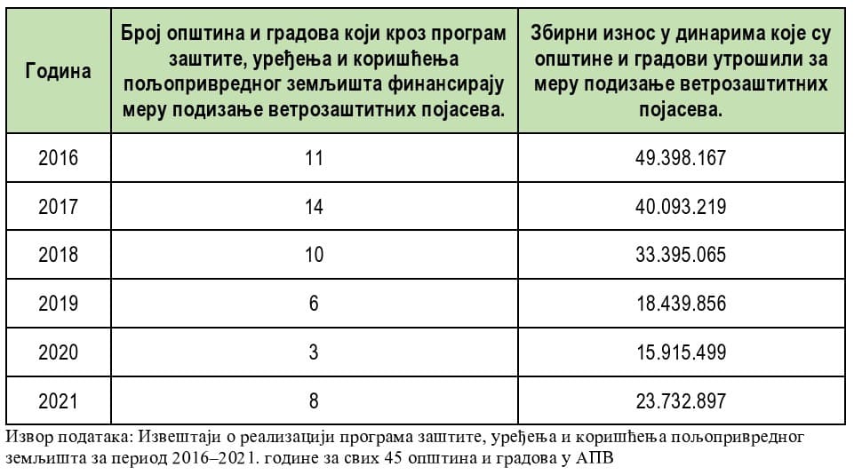 Programom zaštite, uređenja i korišćenja poljoprivrednog zemljišta, koji se sprovodi novcem od zakupa državnog zemljišta, jedna od zakonom propisanih mera je podizanje poljozaštitnih pojaseva. Međutim, vojvođanske opštine i gradovi se uglavnom ne odlučuju da podižu ove pojaseve. Malo je onih koji planiraju, a još manje onih koji sprovode ovu aktivnost. I iznosi utrošenog novca su minimalni, najčešće ispod milion dinara, i svake godine su sve manji. U 2016. godini samo 11 od 45 opština i gradova je za podizanje pojaseva potrošilo oko 49 miliona dinara, da bi u 2021. godini ovo spalo na osam opština sa oko 23 miliona dinara. Od toga gotovo polovina je potrošena samo u Gradu Pančevu. Osim iznosa novca, u izveštajima nema podataka o površinama, ni posađenim vrstama.