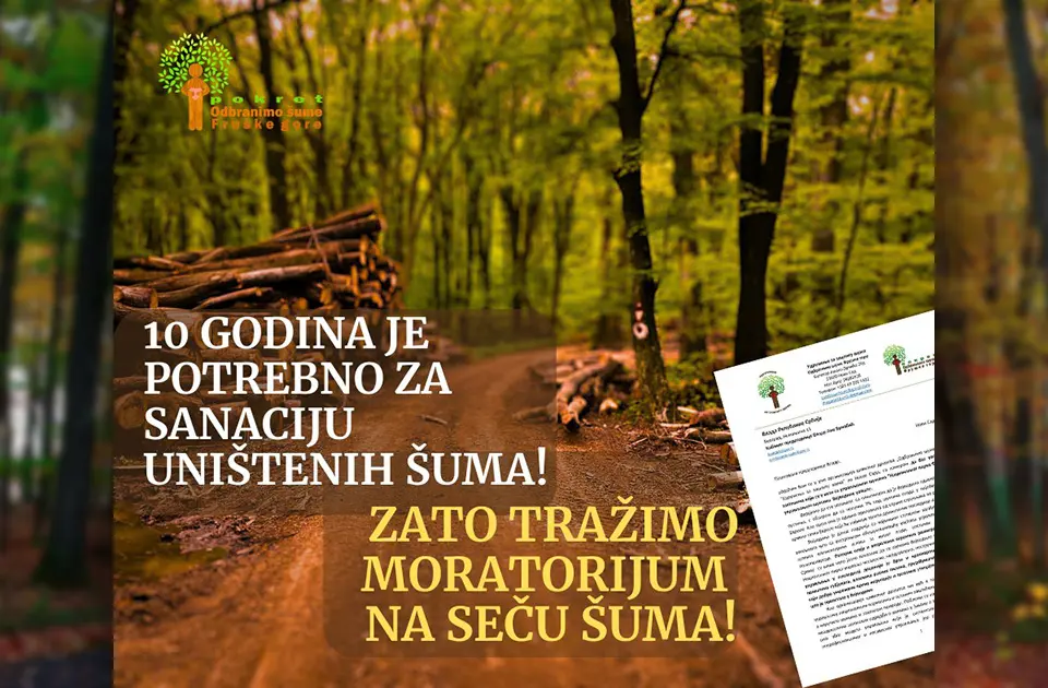- Moratorijum na seču šuma u Nacionalnom parku Fruška gora, na 10 godina minimum, u cilju sanacije i revitalizacije šuma i pošumljavanja. Obešumljenost Vojvodine je inače ogroman nacionalni problem, a posledice olujnih vetroloma su takvih razmera da je šumama Nacionalnog parka i Vojvodine potrebno nekoliko decenija da se oporave.